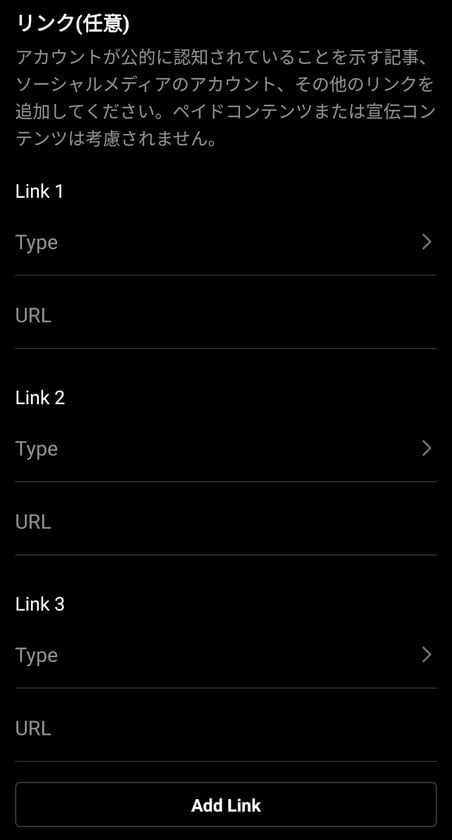 ここでは、アカウントが紹介されているウェブサイト、記事、または他のSNSのURLを入力してください。